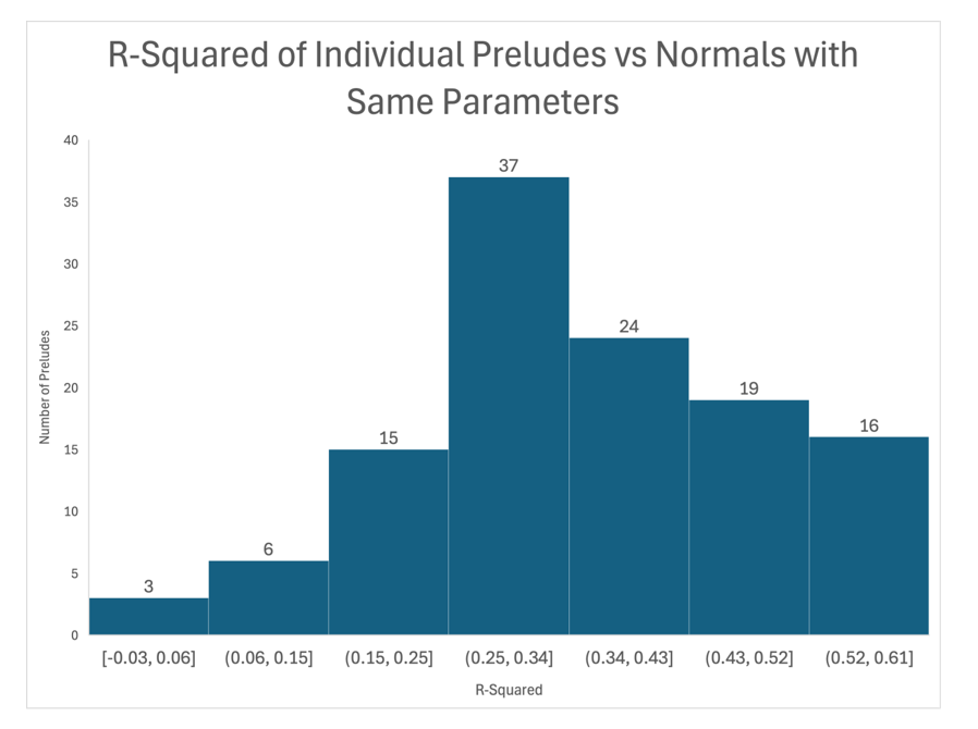 • There was a meaningful fit for a strong majority of the preludes. 96 of the 120 preludes (80%) had an R2 ≥ .25.  This is a satisfactory level of variance explained given that it uses only one explanatory variable (register)