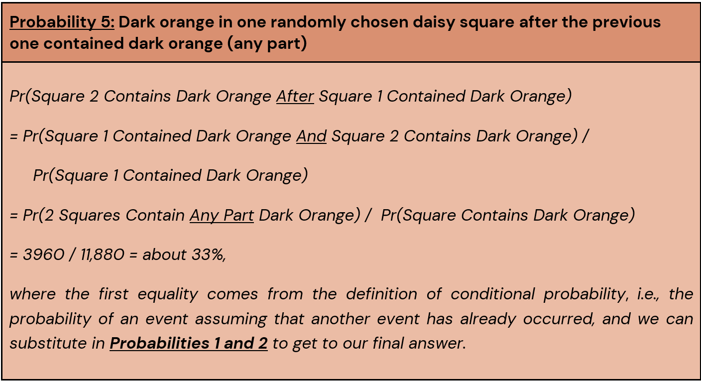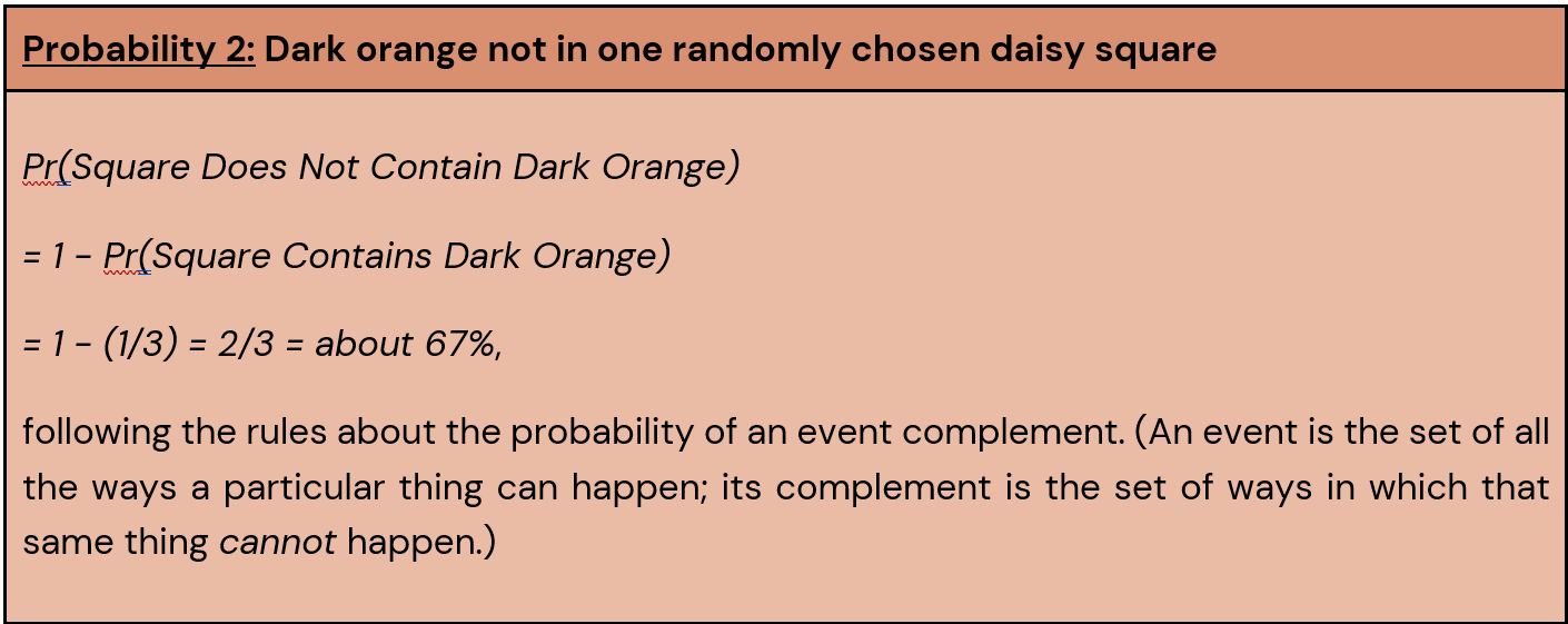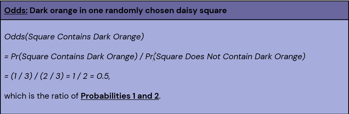 Together, we can use Probabilities 1 and 2 to compute the odds of getting dark orange in a randomly chosen daisy square. Odds are distinct from probabilities – even though the two words are often used interchangeably in popular culture – and can be uniquely useful, particularly for interpretation.