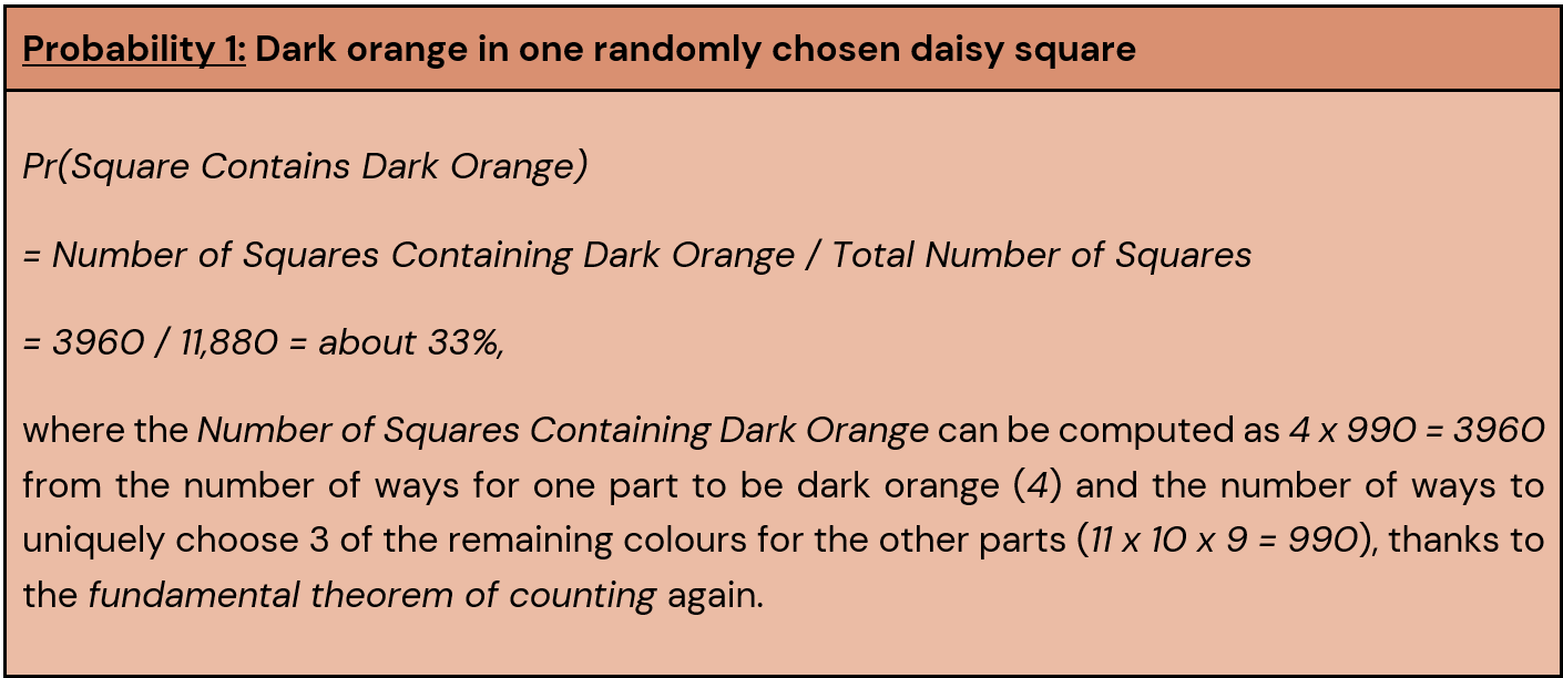 Altogether, every time colours are chosen, 12 x 11 x 10 x 9 = 11,880 possible daisy squares could be created. We get this number from the fundamental theorem of counting, which says that if there are 12 ways to do the first task, 11 to do the second, 10 to do the third, and 9 to do the fourth, then there are 12 x 11 x 10 x 9 ways of doing all 4 together! Aren’t you glad we didn’t try to write them all out? Now, let’s dig into the main event (the probabilities).