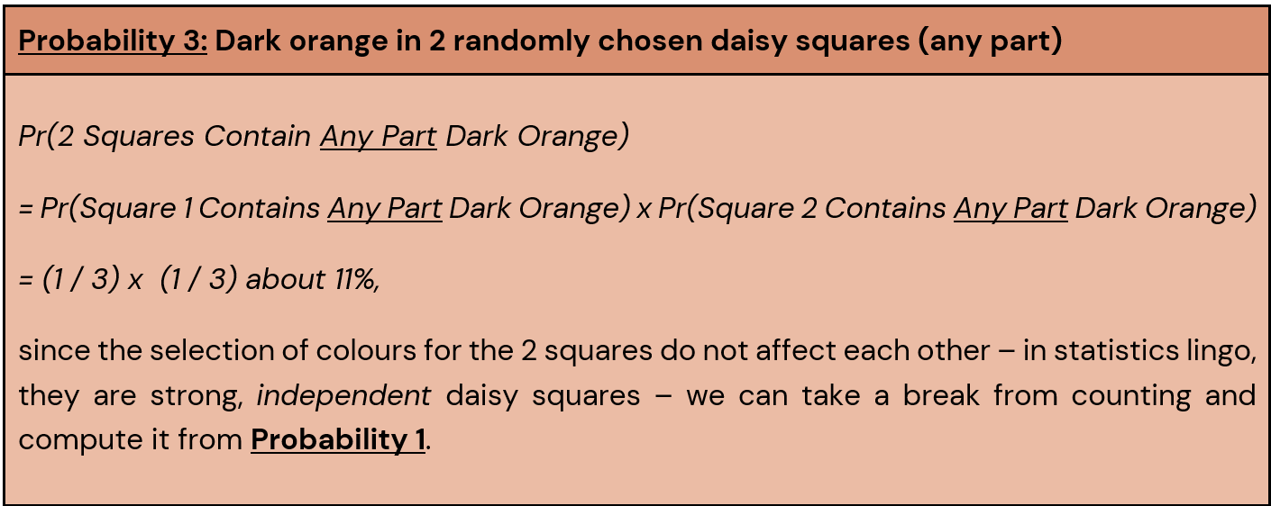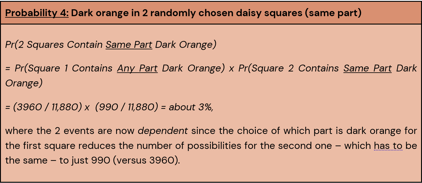 Yikes, at 11% it’s probably more probable than we’d like to randomly draw dark orange for not just 1, but 2 daisy squares! If it’s any comfort, this probability shrinks a lot if we focus on getting dark orange in the same part of 2 daisy squares.