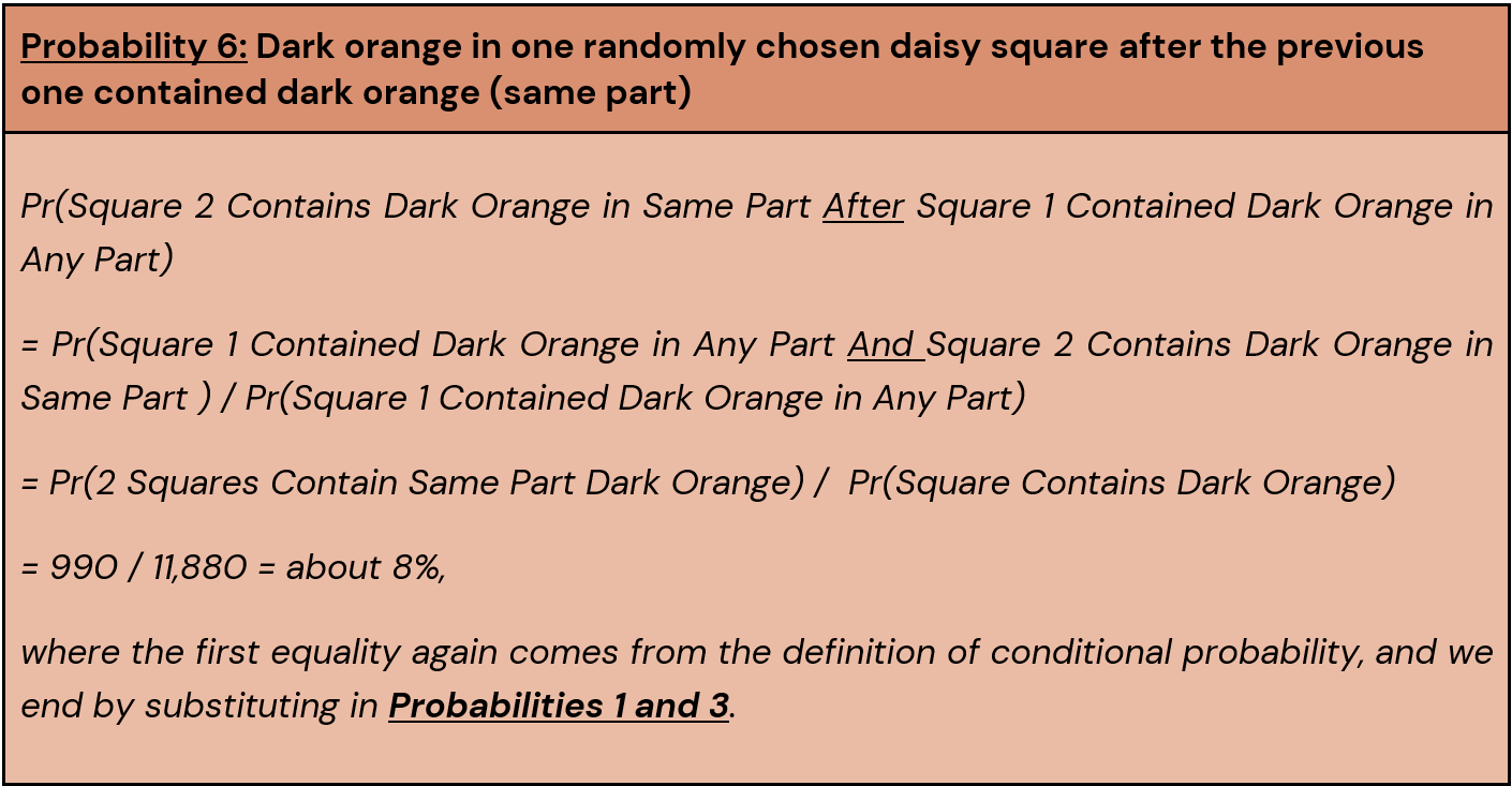 No matter what squares have come before, the probability that the next one will contain that dreaded colour will always be the same: 33%. The squares’ independence implies that Pr(Square 2 Contains Dark Orange After Square 1 Contained Dark Orange) is just equal to Pr(Square 2 Contains Dark Orange). But what if we once again were interested in the dark orange being in the same part?