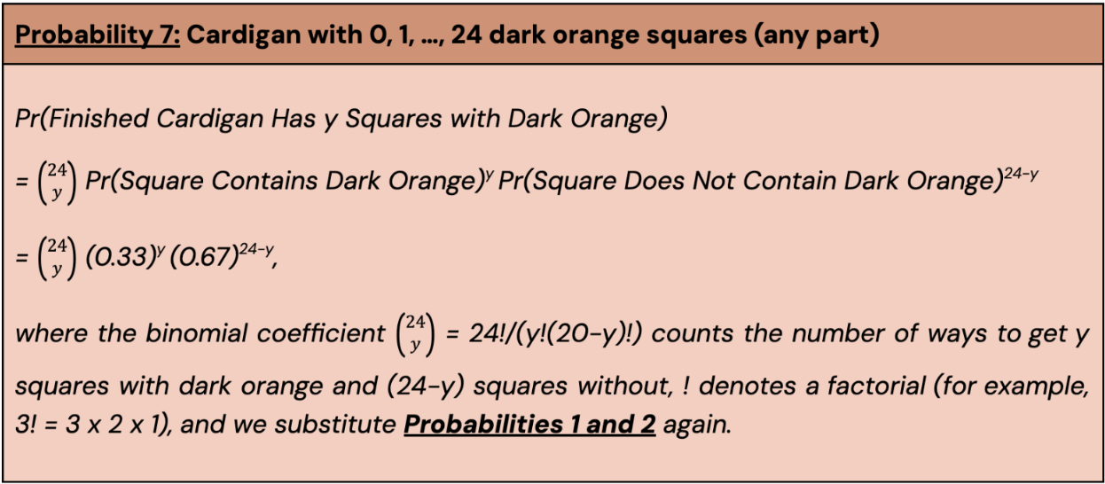Now, I promise the vocabulary lesson is worth it because binomial experiments have their own well-established formulas that we can use to find the probability of having a particular number – let’s call it y – of dark orange squares in the finished cardigan, where y can be anything from 0 (no dark orange) to 24 (all dark orange).
