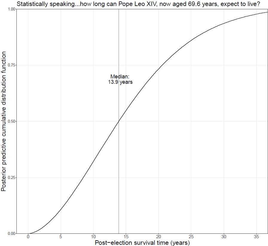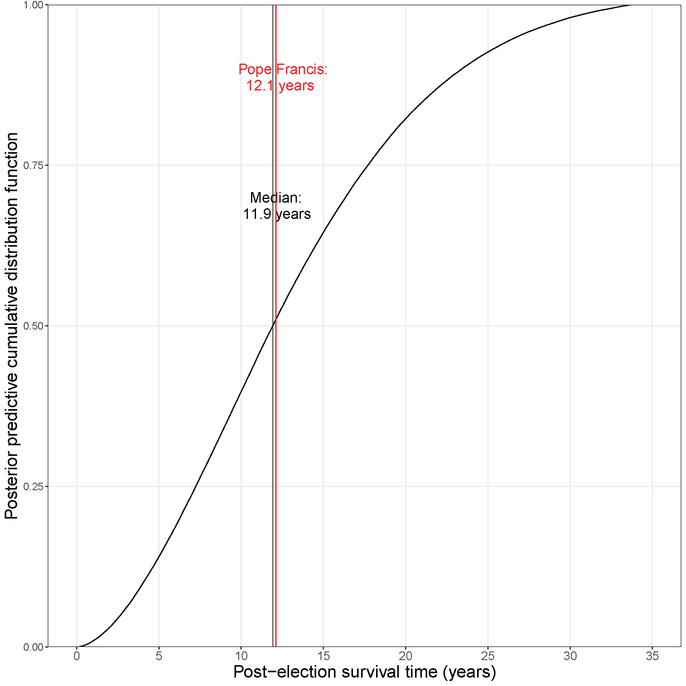 We fitted a Weibull model with age at election and year of election as covariates to data from 63 popes elected since 1404. Statistical inference was performed in the Bayesian framework using Stan. This allowed us to find posterior predictive distributions for post-election survival time. Figure 2 shows the posterior predictive post-election survival time cumulative distribution function for someone becoming pope in 2013 age 76 years, such as Francis. The median of this distribution is 11.9 years. This point prediction is very close to Francis’s observed post-election time of 12.1 years. This yields a form of empirical validation of our model and provides an enormous improvement over the prediction made by Francis in 2014!