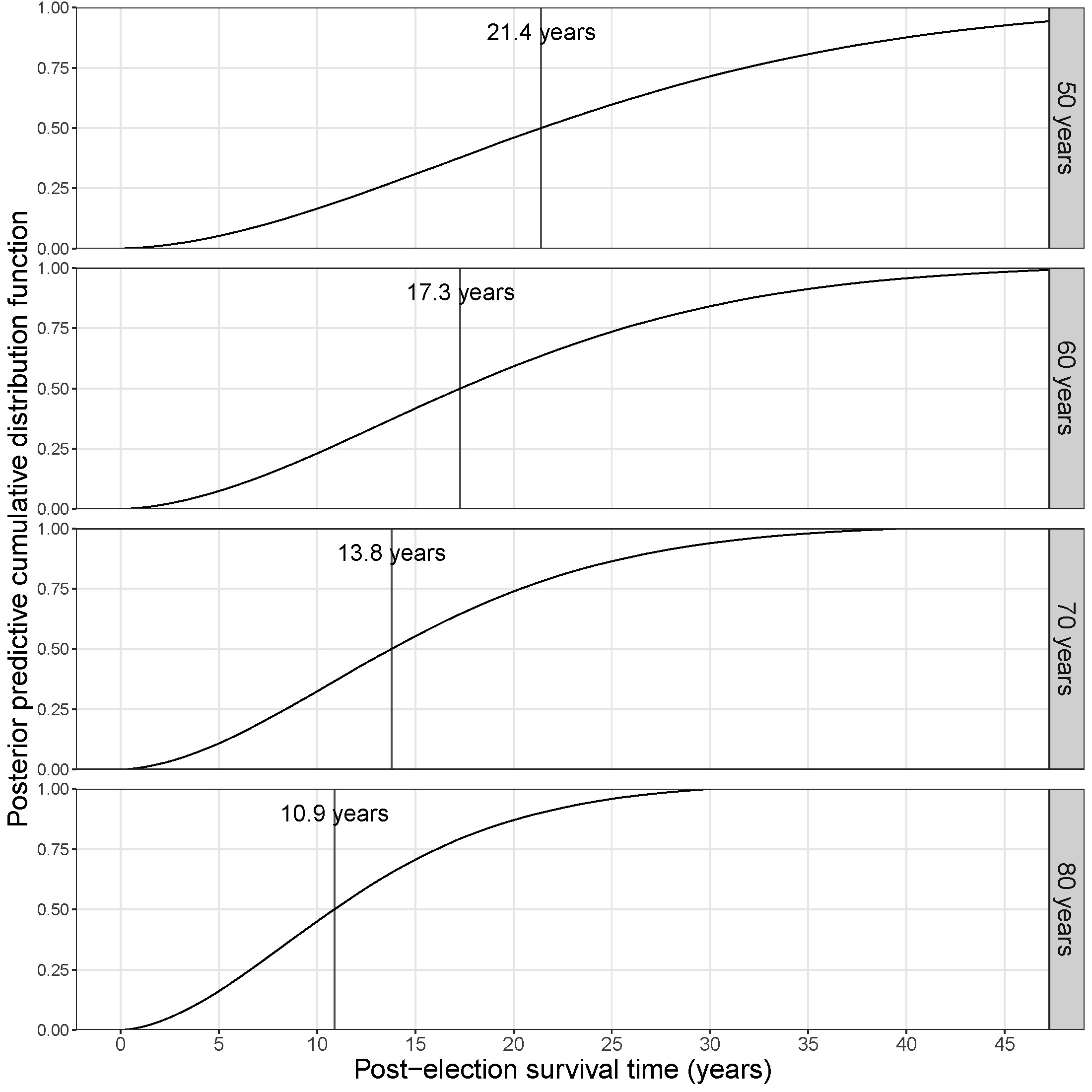 Figure 3: Posterior predictive cumulative probability distribution functions of post-election survival time for hypothetical popes elected in May 2025