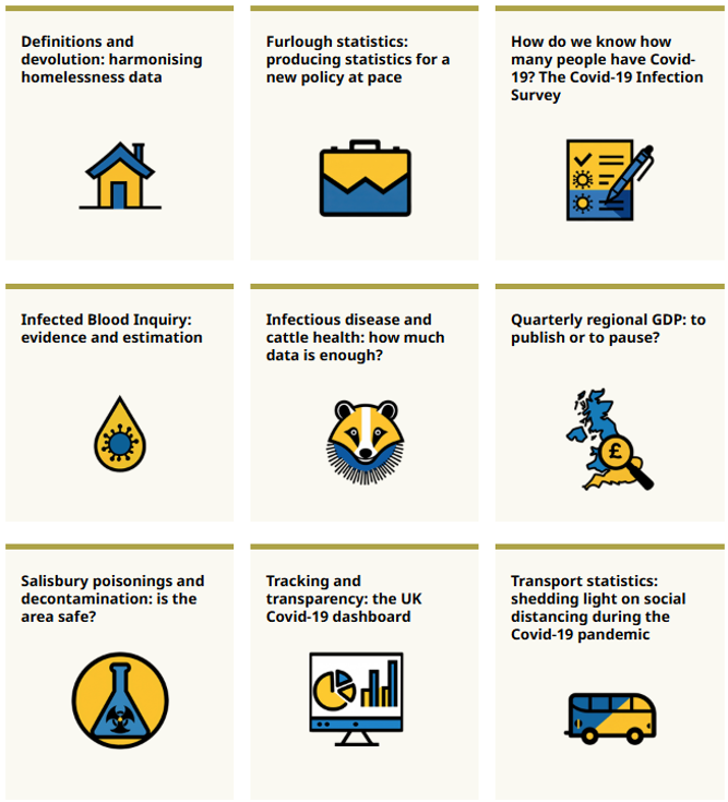 Our nine case studies cover a wide range of prominent statistical and data projects, with examples from the Covid-19 pandemic – and before – to more recent examples, including in health, economics, and public statistics.