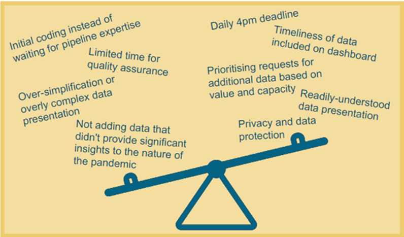 Figure 2: Infographic illustrating factors that had to be balanced in the Covid-19 dashboard case study.