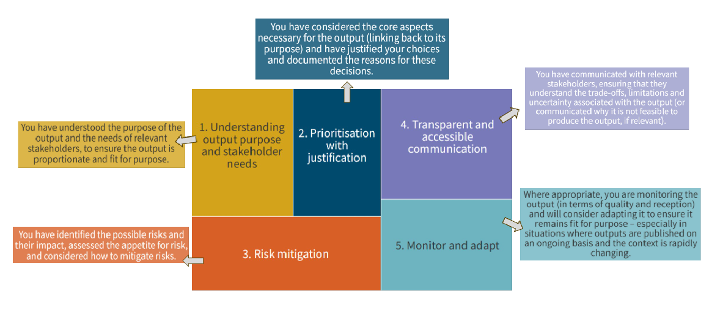 - Monitor and adapt – are you monitoring the quality of the output and its reception, including understanding factors influencing this? Are you considering refining and improving as context and demands change, and communicating the reasons for any changes? Are you considering the impact of adapting outputs (e.g. on continuity/comparability)?