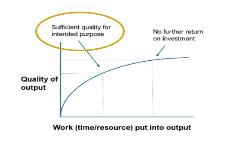 Figure 4: Image illustrating an example relationship between work (time/resource) and output quality. The first dotted line indicates sufficient quality for intended purpose, which depends on the work invested. The second dotted line indicates that there will be a point at which further work makes no appreciable improvement to quality.